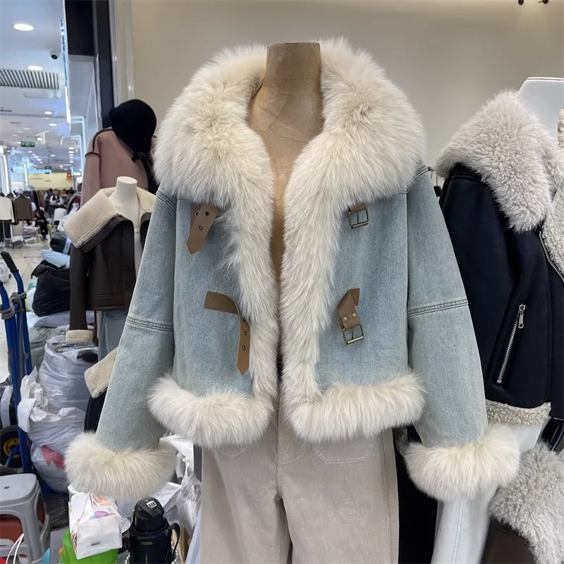 جاكيت جينز نسائي شتوي من Sweet Hot GirI مصنوع من الفرو ومطرز بنقشة زهور وياقة مطوية وصدر واحد، ملابس نسائية فضفاضة وعصرية