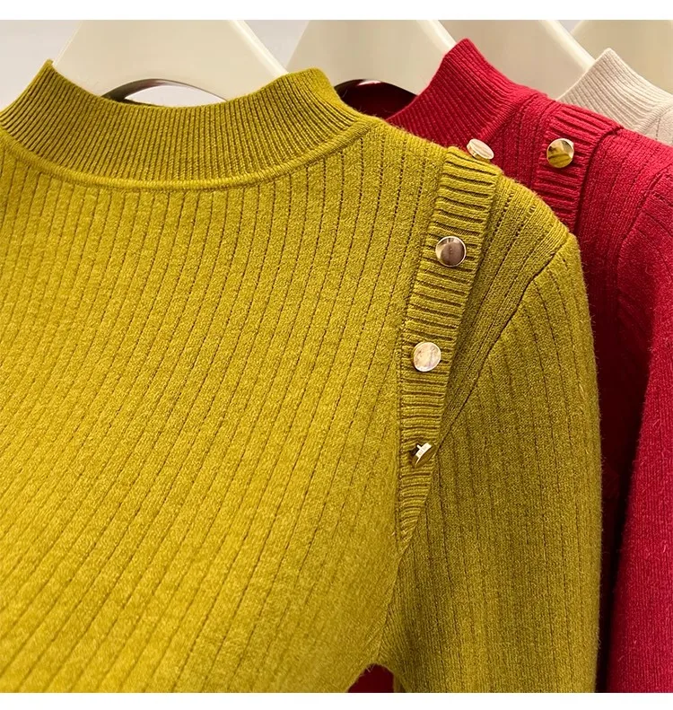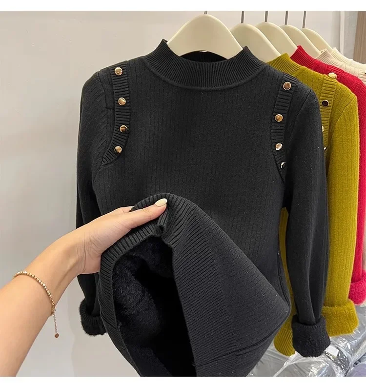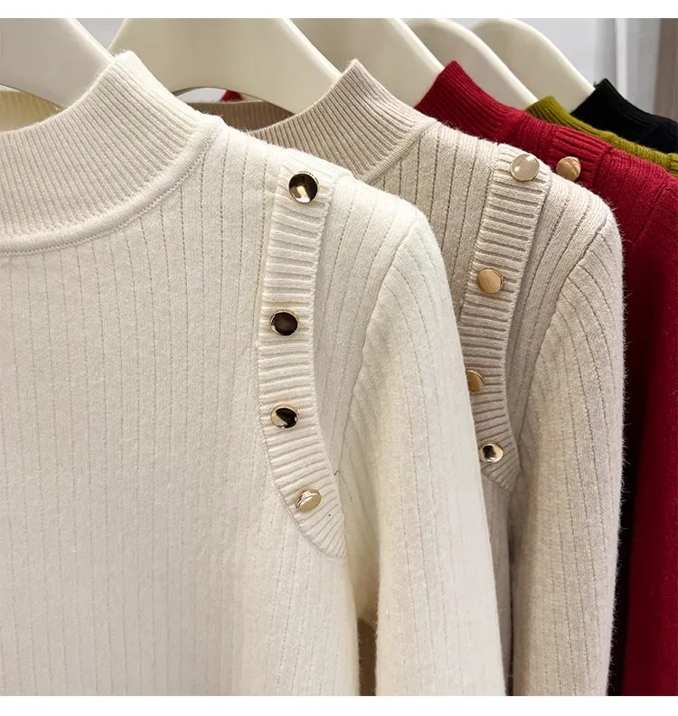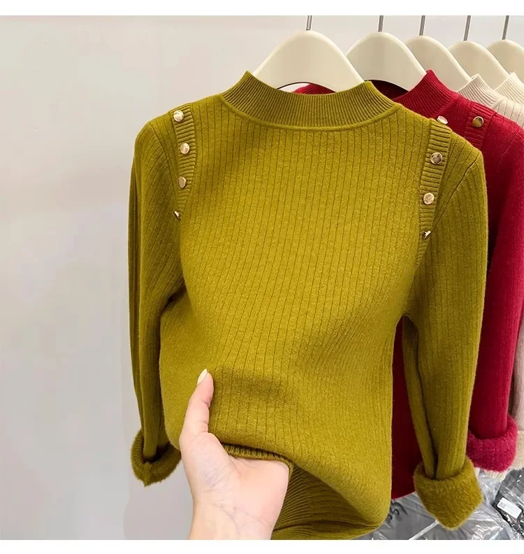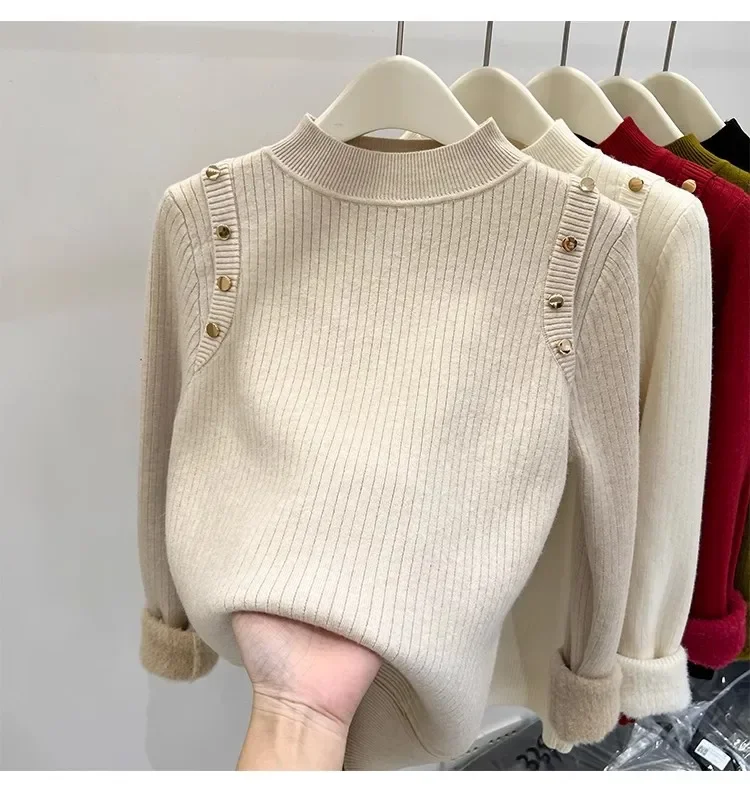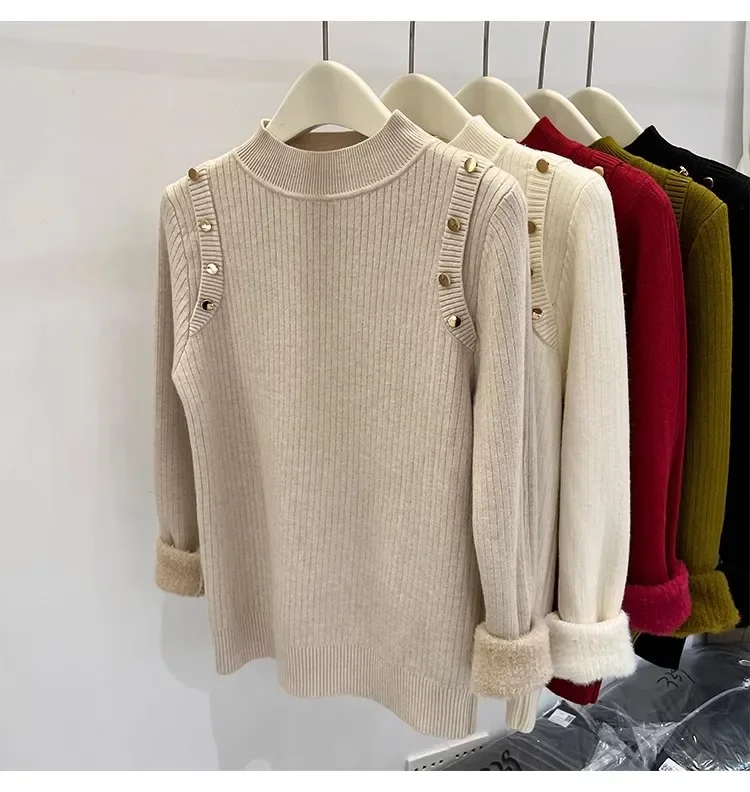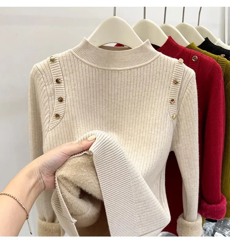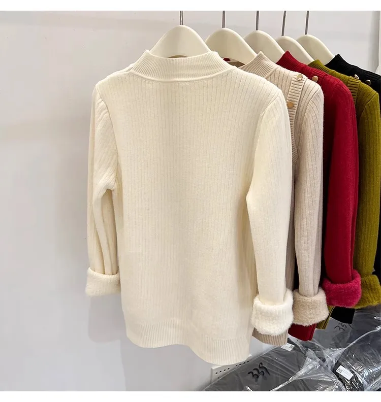 Autumn Winter Women Pullovers Button Turtleneck Knitted Sweater 2025 Basic Women's Wool Lined Thick Warm Sweaters