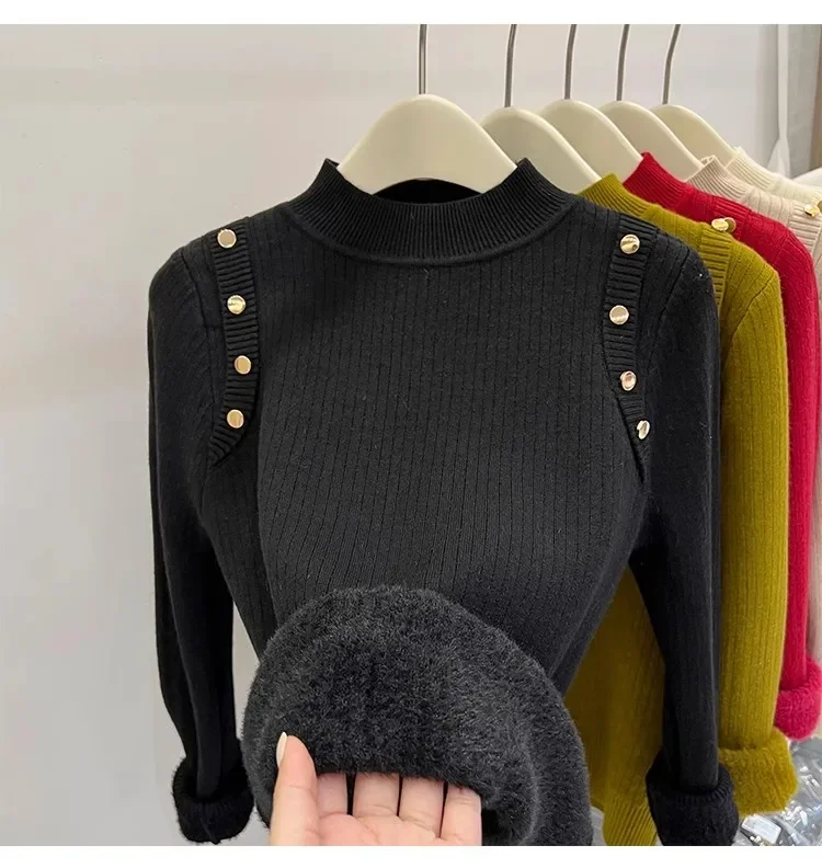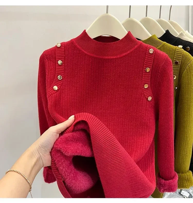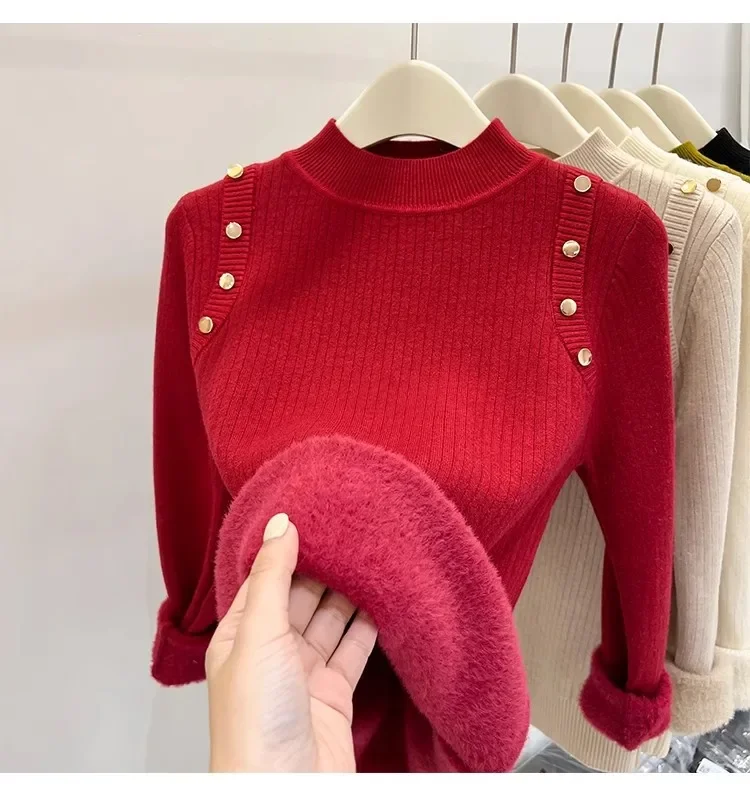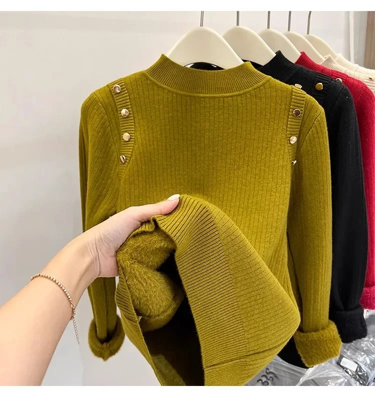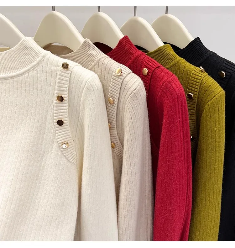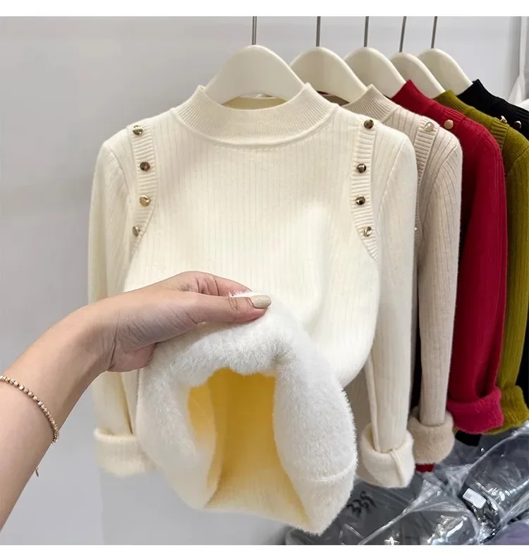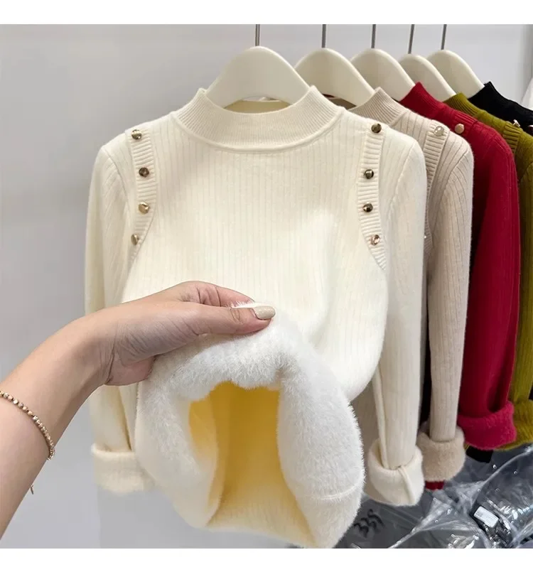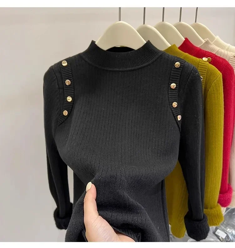 Autumn Winter Women Pullovers Button Turtleneck Knitted Sweater 2025 Basic Women's Wool Lined Thick Warm Sweaters